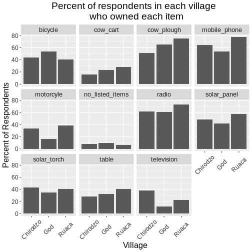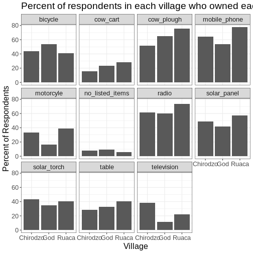labs(title = "Percent of respondents in each village \n who owned each item",